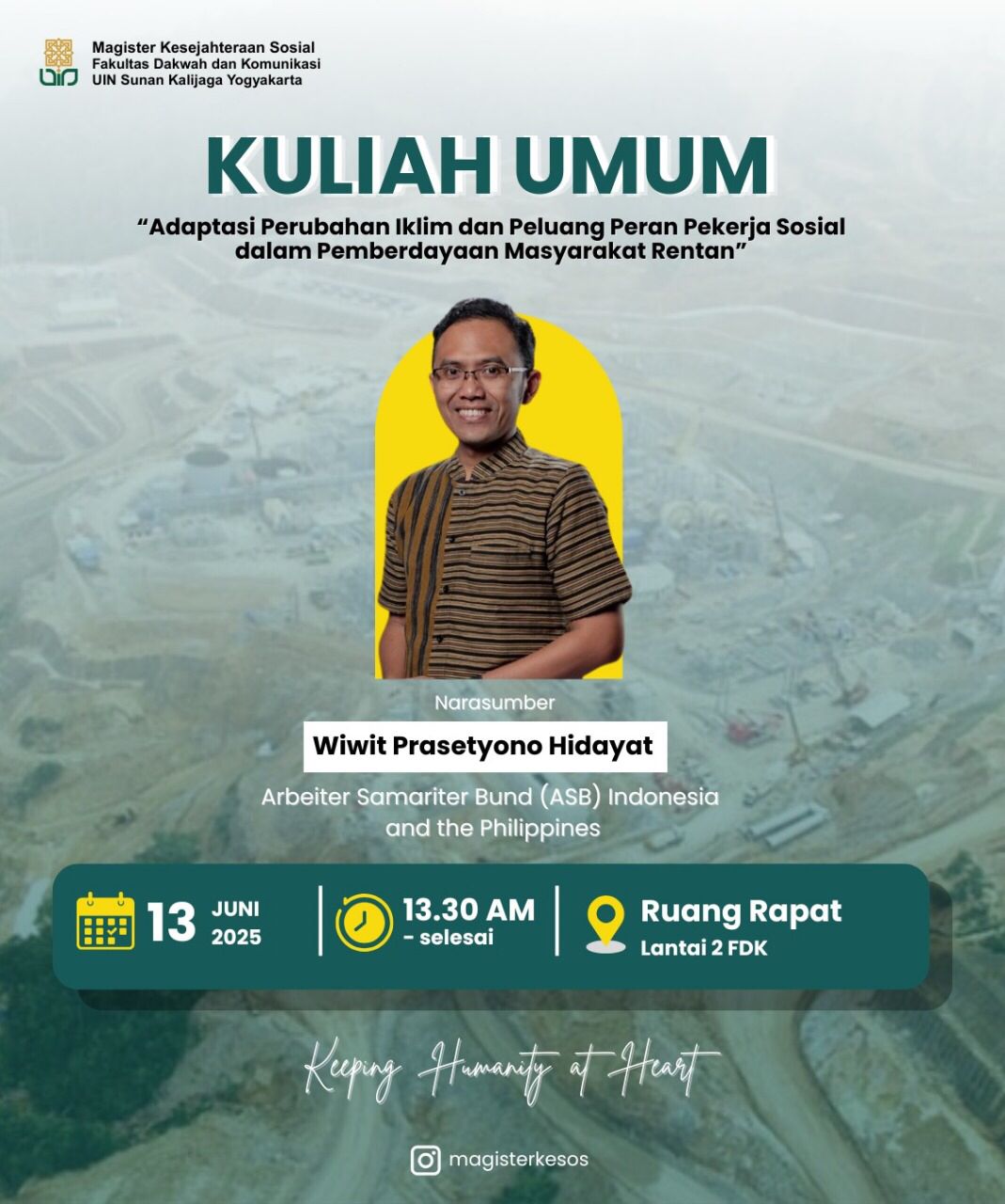 Kuliah Umum Magister Kesejahteraan Sosial: “Adaptasi Perubahan Iklim dan Peluang Peran Pekerja Sosial dalam Pemberdayaan Masyarakat Rentan” Program Studi Magister Kesejahteraan Sosial, Fakultas Dakwah dan Komunikasi UIN Sunan Kalijaga Yogyakarta Selasa, 10 Juni 2025 18:51:13 WIB Dilihat : 329 Kali Unduh